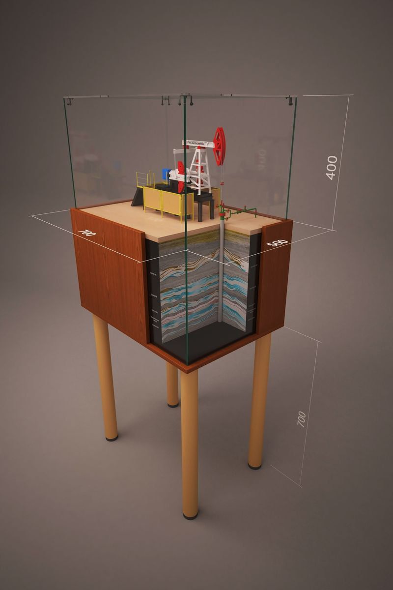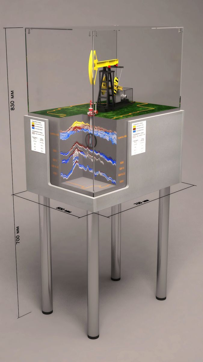 Наименования пластов расположены по обеим сторонам макета. На поверхности макета, где расположена ШГН, видны четкие границы месторождения.