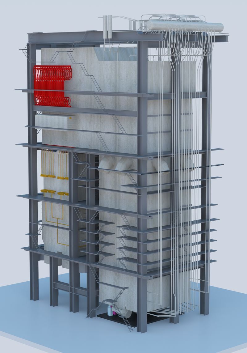 3D модель парового котла создана по чертежам, предоставленным компанией заказчика. Модель выполнена как точная копия реальной установки и проработана до мельчайших деталей.