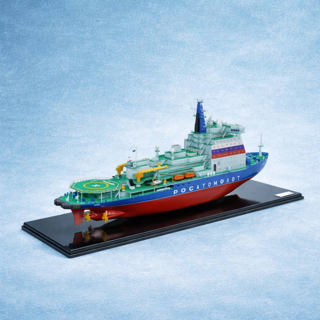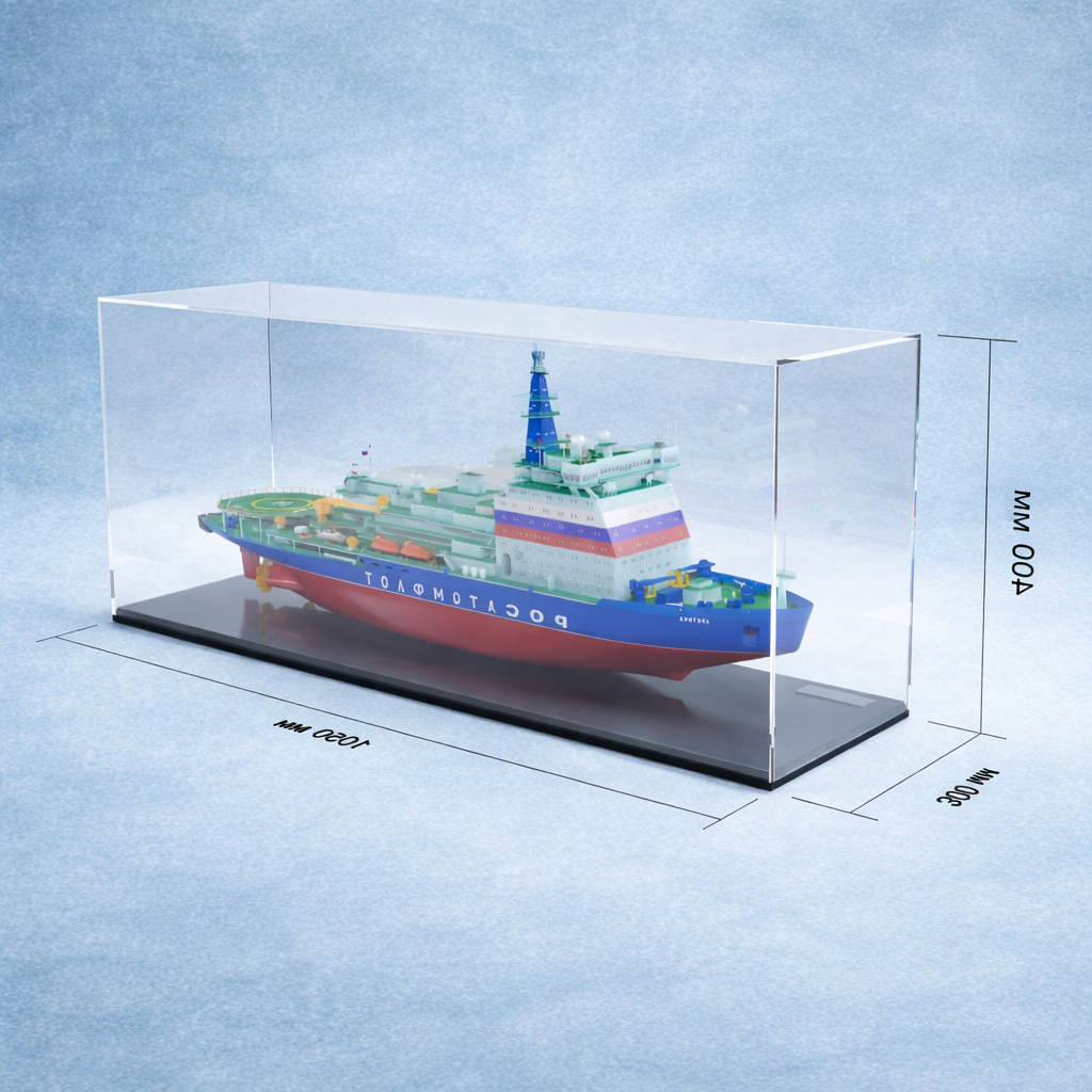 3D модель «Ледокол Арктика». Модель выполнена с высокой точностью и размещена в стильной прозрачной витрине, которая подчеркивает ее презентабельность и защищает от внешних воздействий. Размеры витрины: 1050 х 300 х 400 мм - оптимально для демонстрации в офисе, музее или коллекции. Воспроизведены все ключевые элементы ледокола: надстройка с радиолокационной мачтой, вертолетная площадка, гребные винты, палубы с оборудованием, спасательные шлюпки, люки.