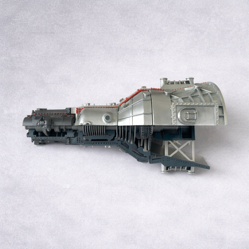 3D модель «Паровая турбина Кп-77-6,8». Это модульная платформа мощностью до 100 МВт, пригодная для утилизации ТКО, ПГУ и ПСУ. Ключевая особенность- осевой выхлоп низкого давления, что уменьшает габариты и упрощает интеграцию в энергоцикл.