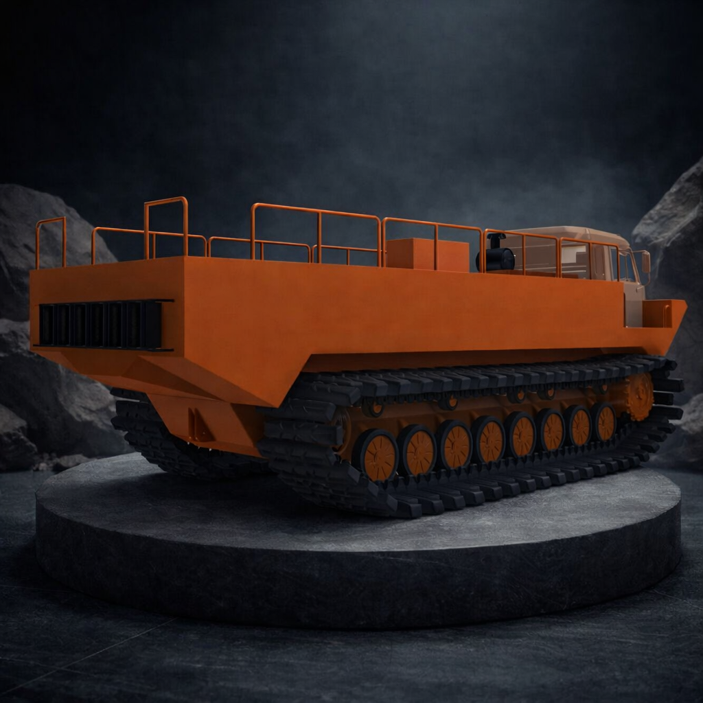 При моделировании было детально проработали гусеницы и катки, обеспечивающие визуальную достоверность и подчеркивающие проходимость болотохода. Проработана реалистичная кабина с имитацией стекол и внутренних элементов, просторная площадка с защитными перилами для размещения насосного оборудования.