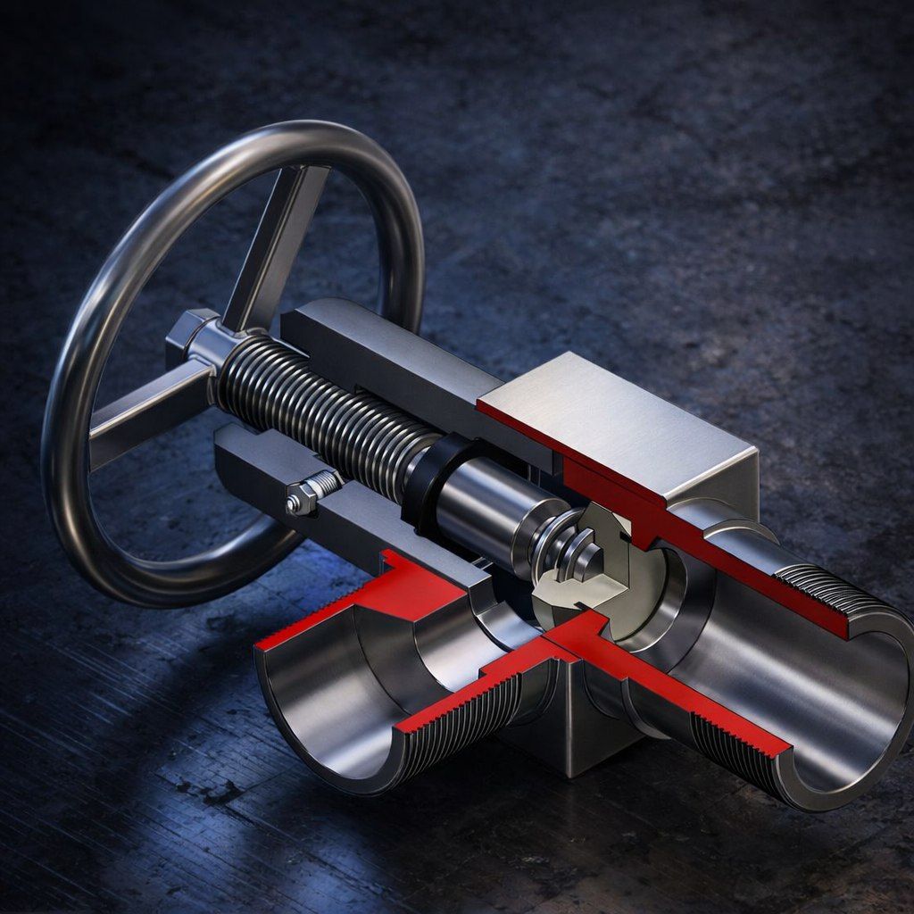 3D модель «Вентиль запорной арматуры угловой». Состоит из корпуса, который соединяет два участка трубопровода под углом 90° и изготавливается из различных материалов в зависимости от условий эксплуатации; штока, передающего усилие от рукоятки или привода к запорному элементу; запорного элемента, перекрывающего или регулирующего поток; уплотнительных прокладок, обеспечивающих герметичность; и рукоятки или привода для управления клапаном.