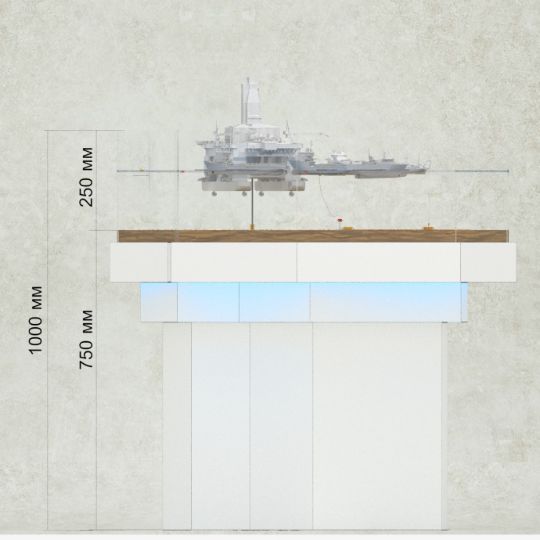Макет условно разделен на 4 сектора. При движении по часовой стрелке вокруг макета можно наблюдать все основные этапы геологоразведки морского месторождения: