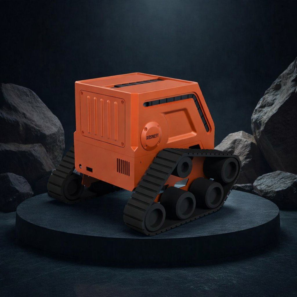 3D-модель компактного промышленного робота с гусеничным ходом. Дизайн выполнен в современном технологичном стиле с акцентом на функциональность и устойчивость. Модель проработана с учётом мелких технических деталей — видны крепёжные элементы, технологические швы, рельефные линии на корпусе, усиливающие ощущение реалистичности.