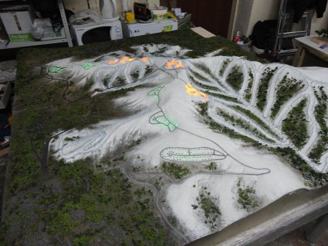 На макете расположен рельеф с зелеными насаждениям, дороги, пятна застройки со строениями, трассы подсвечены изнутри светодиодной подсветкой с пультовым управлением, внешняя подсветка софитами с пультовым управлением.
