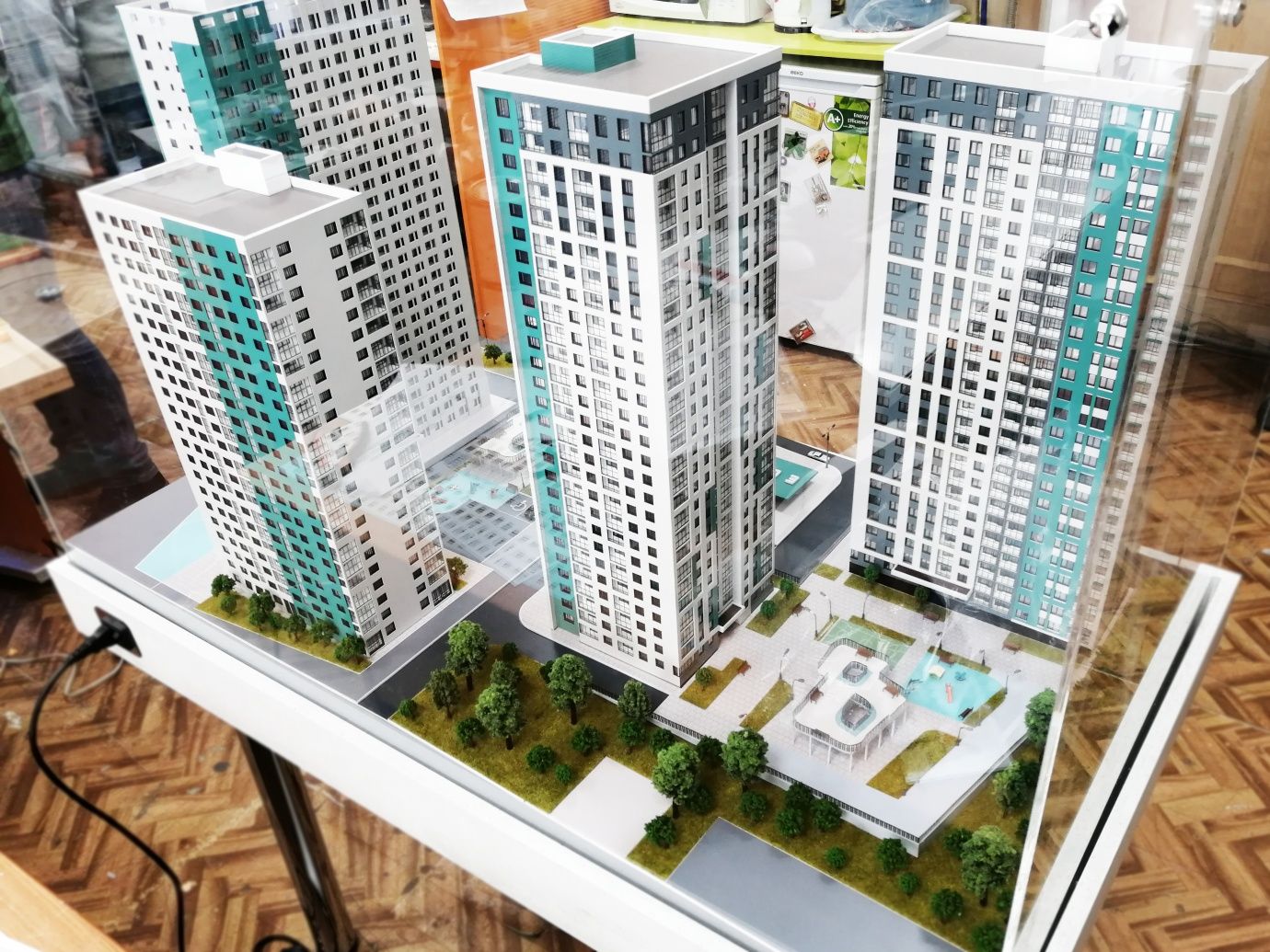 Масштабный макет изготовлен на основе чертежей, 3D визуализаций, предоставленных Заказчиком, предназначен в качестве экспоната в отделе продаж.