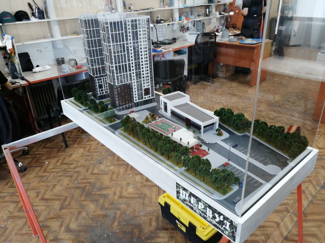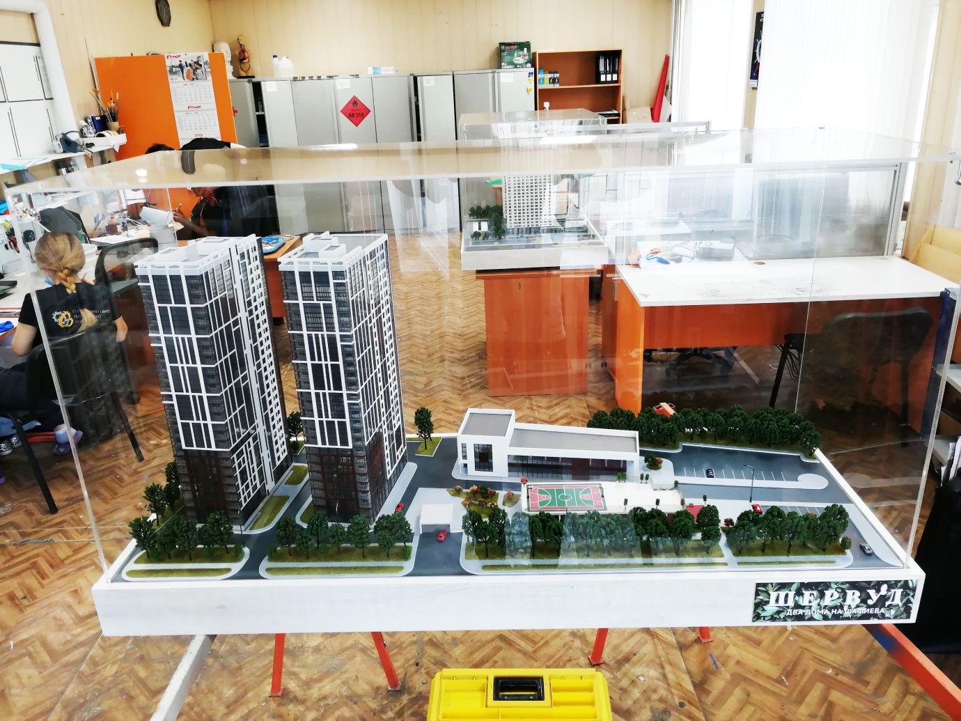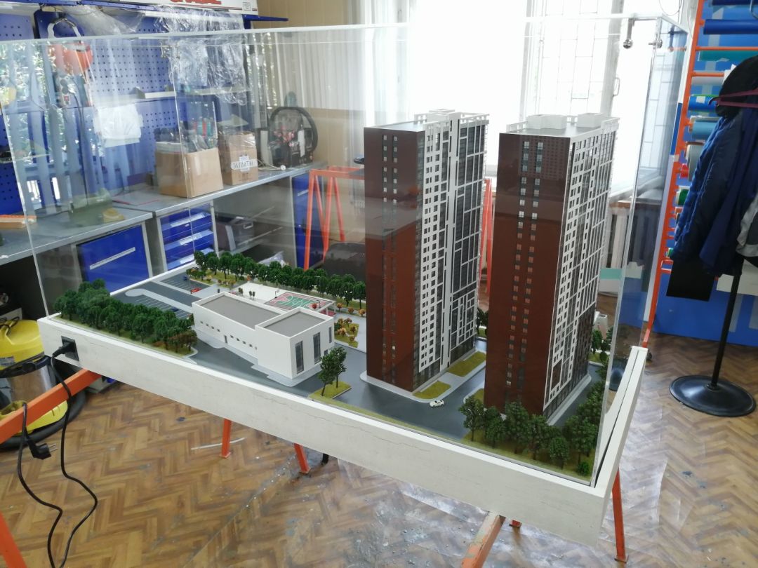 Масштабный макет изготовлен на основе чертежей, 3D визуализаций, предоставленных Заказчиком, предназначен в качестве экспоната в отделе продаж.