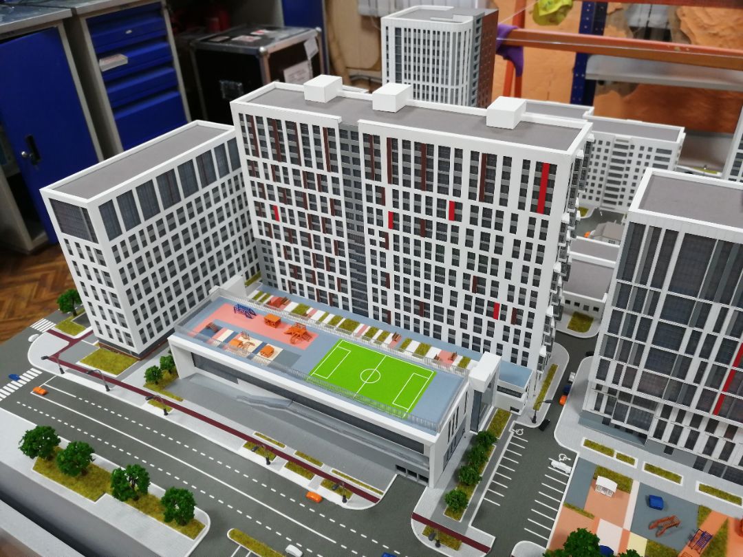 Масштабный макет изготовлен на основе чертежей, 3D визуализаций, предоставленных Заказчиком, предназначен в качестве экспоната для офиса продаж.
