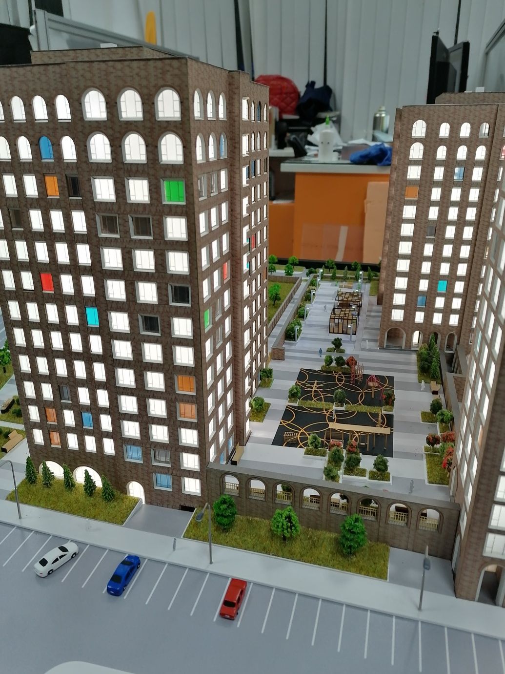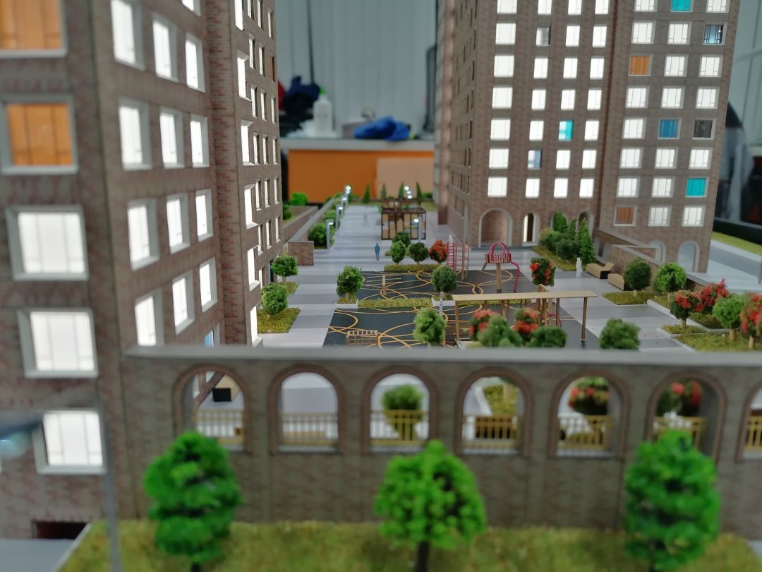 На макете также должны присутствуют: деревья, газоны, клумбы, машины, тротуары, развязки дорог, въезд/выезд, заборы, фонарные столбы, площадки, скамейки. Все согласно масштаба и согласно плана благоустройства.
