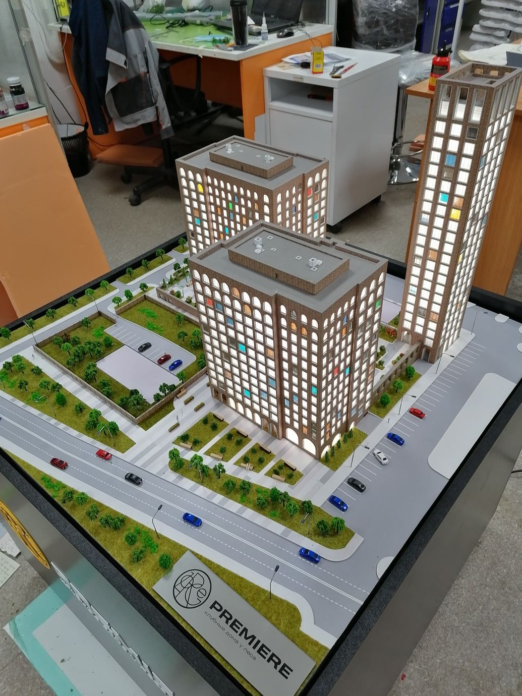 Архитектурный макет в высокой детализации, предназначен для размещения в офисе продаж строительной компании наших постоянных Заказчиков – «Жилстройинвест». На макете тщательно проработано благоустройство, внутренний двор, включая детские и спортивные площадки.