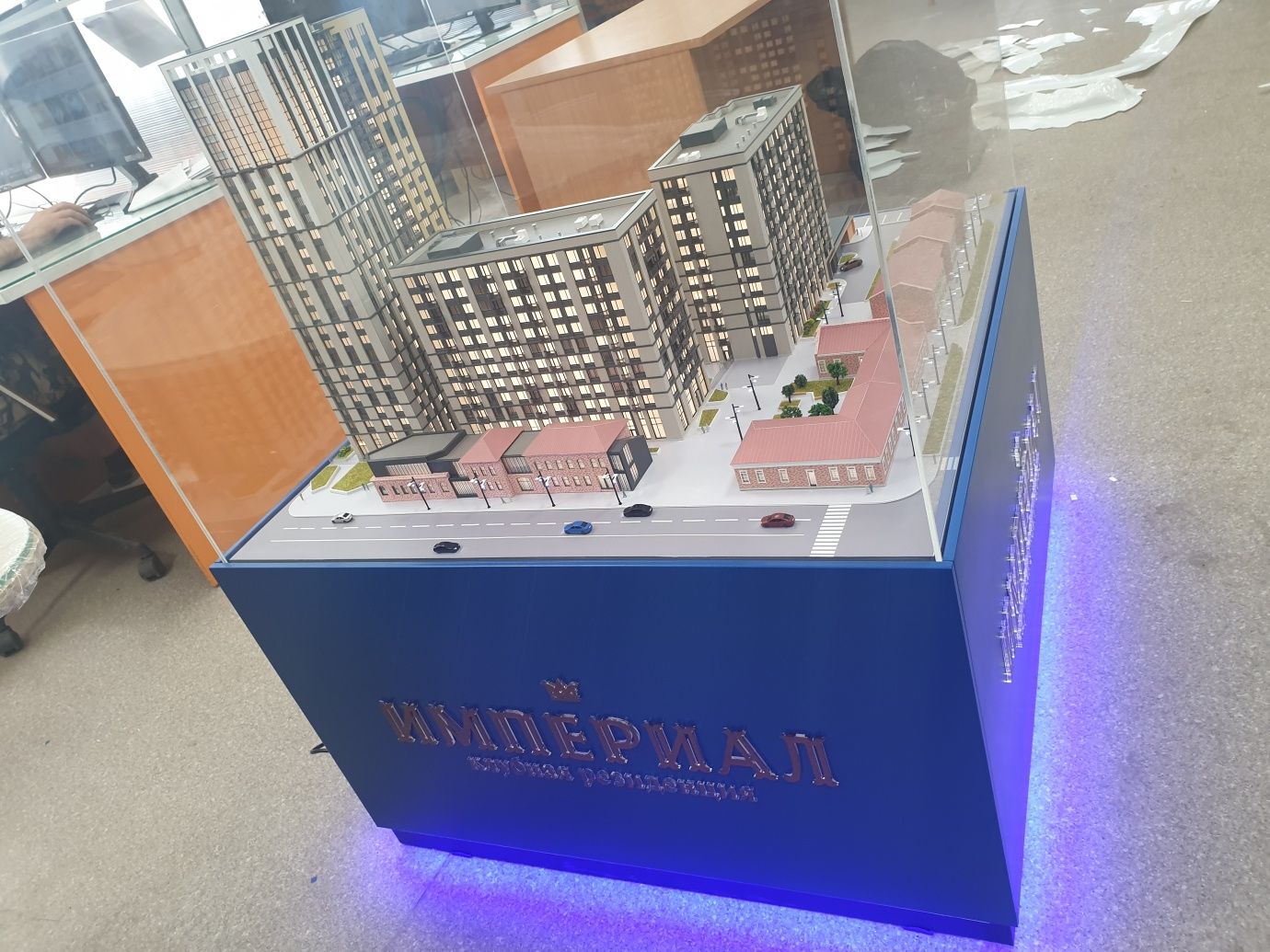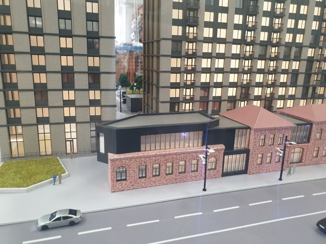 Архитектурный макет жилого комплекса выполнен в высокой степени детализации, имеет внутреннюю подсветку строений, подсветку фонарей освещения, подсветку фар автомобилей в макете.