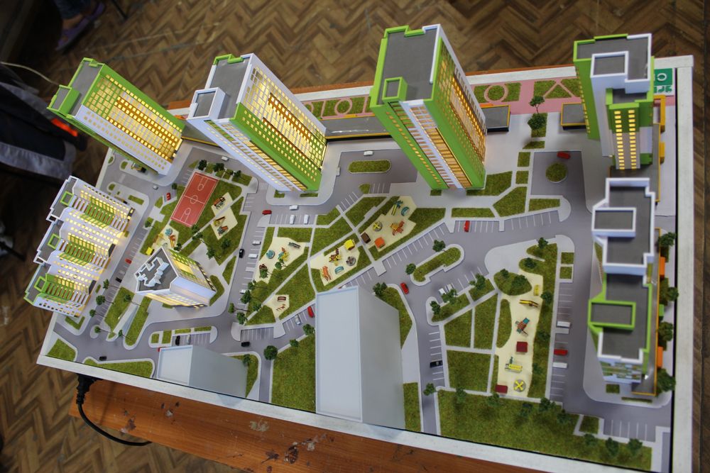 Масштабный макет изготовлен на основе чертежей, 3D визуализаций, предоставленных Заказчиком, предназначен в качестве экспоната для офиса продаж.