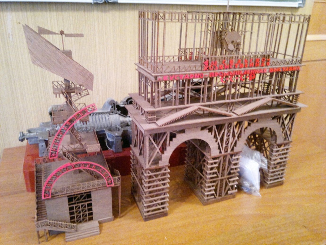 Макет изображает выставочный павильон, располагавшийся в парке им. М.Горького на Всесоюзной выставке достижений Советского Союза в 1920-х годах