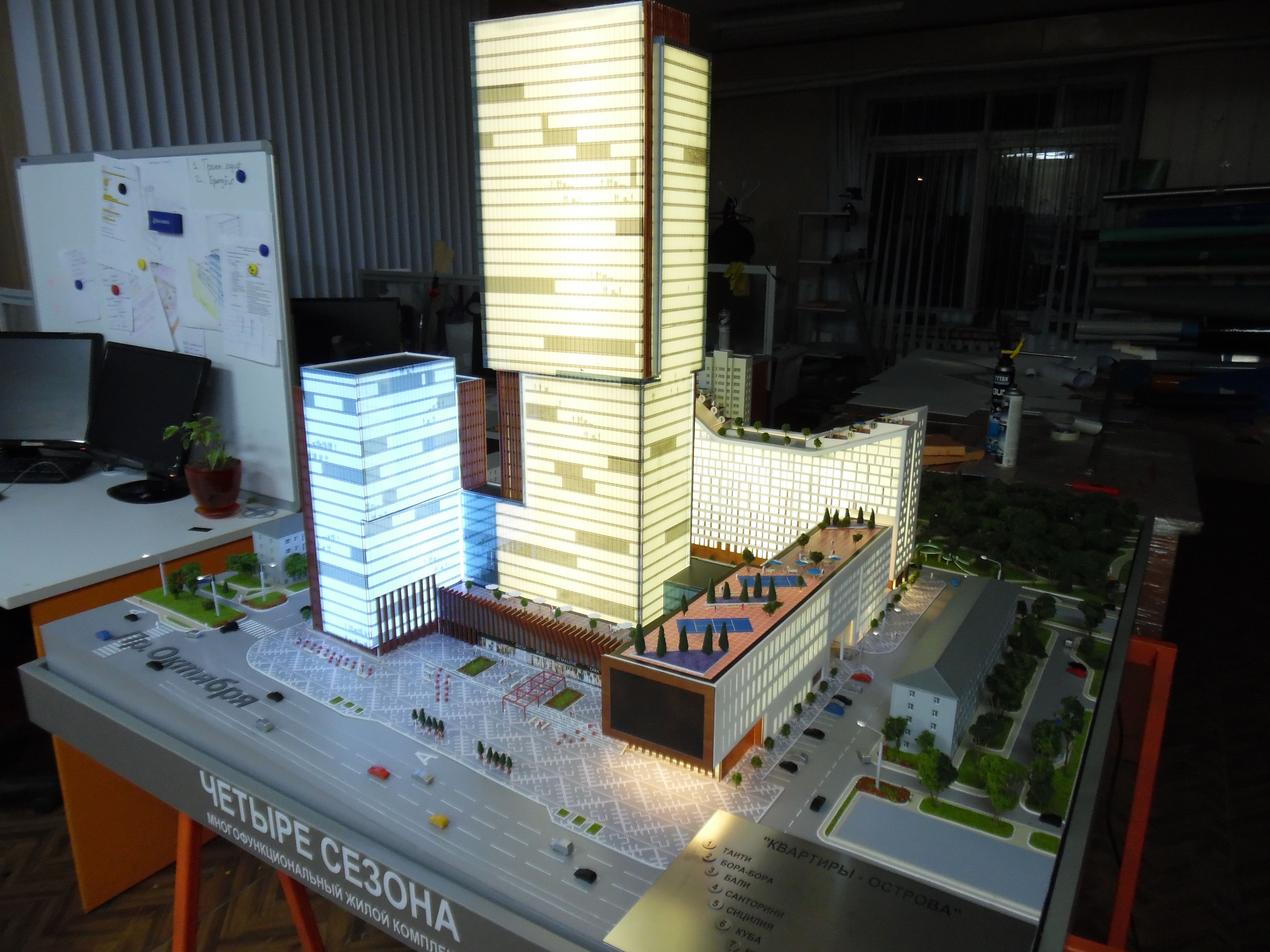 Масштабный макет изготовлен на основе чертежей, 3D визуализаций, предоставленных Заказчиком, предназначен в качестве экспоната для офиса продаж.
