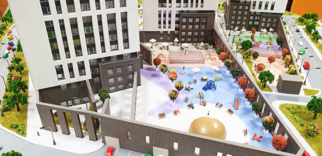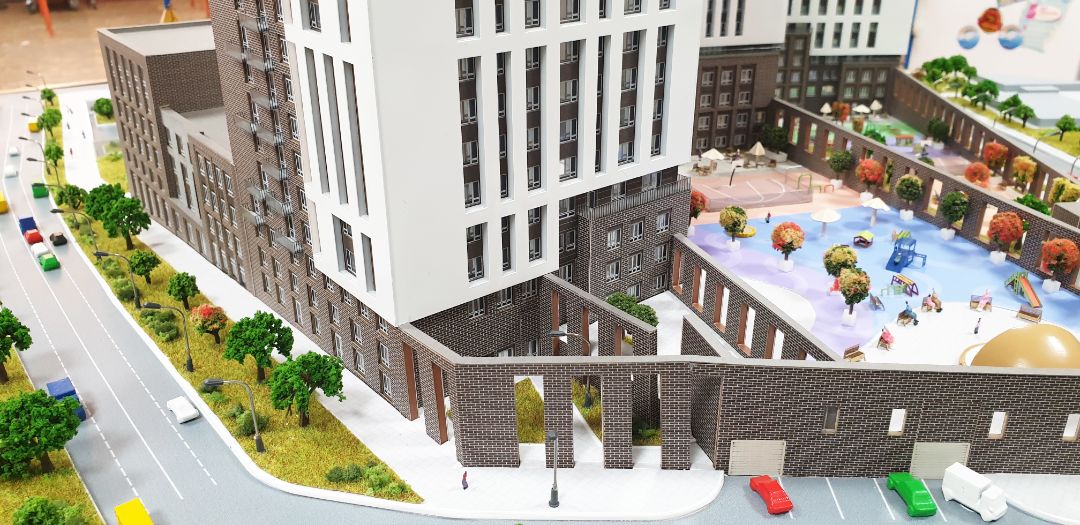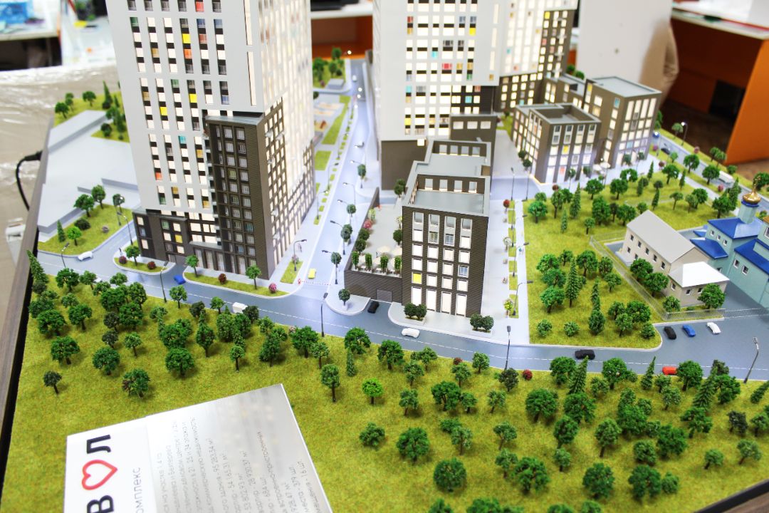 Масштабный макет изготовлен на основе чертежей, 3D визуализаций, предоставленных Заказчиком, предназначен в качестве экспоната для офиса продаж.