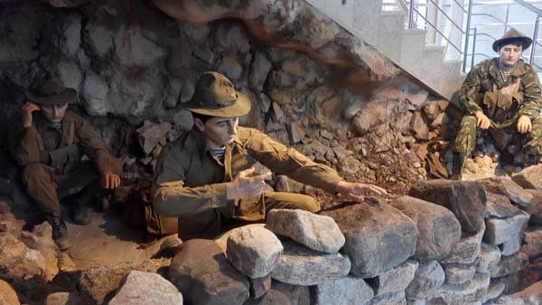 Экспозиция, посвященная периоду времени Афганской войны (1979-1989 г.), представляет собой фрагмент военных действий в 1985-1986 годы. Укрепление «кладка», три советских воина находятся на позиции, одеты в форму десантников, на головах каски или панамы, на ногах берцы «экспериментальные». Один воин в звании капитана (на погонах звезды зеленого цвета), один воин сержант – это связист группы, и один воин пулеметчик в звании рядовой СА. На бойцах бронежилеты (легкие) и разгрузки, оружие – 2 автомата АКС -74 (калибр 5-45), пулемет Калашникова ПК. На позиции размещены РД (рюкзак десантника), фляжки (для десантников), старое кострище. Нашими специалистами произведен монтаж на территории музея.