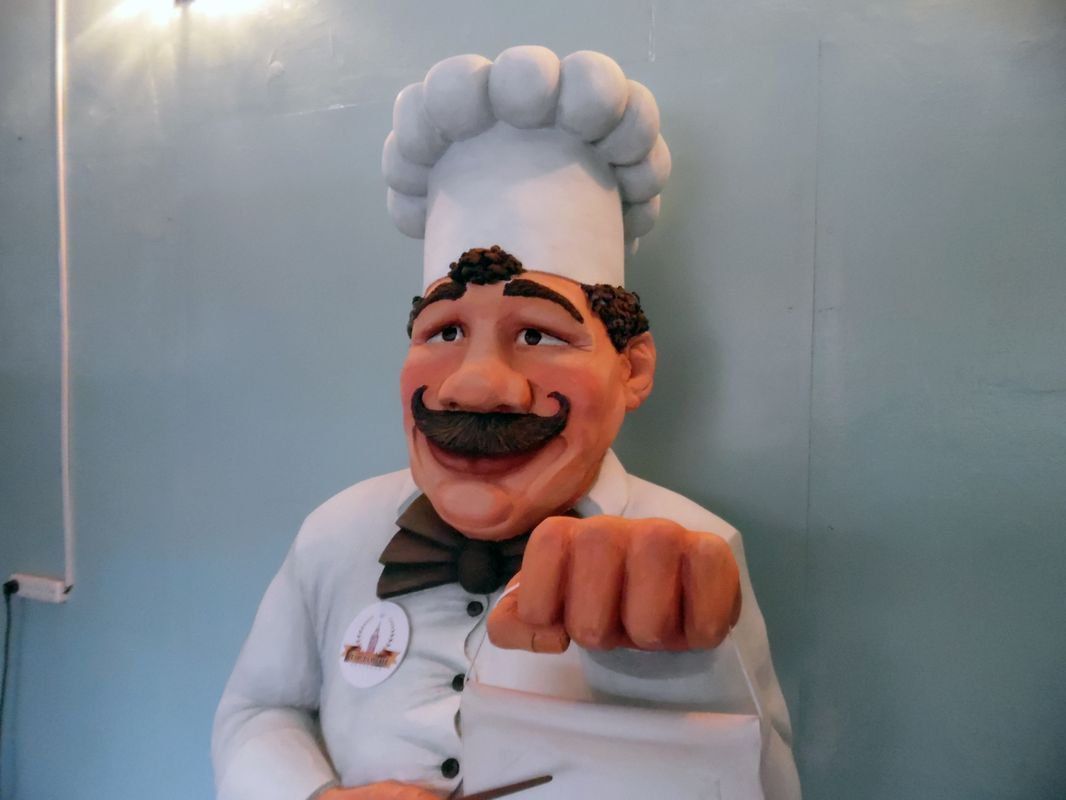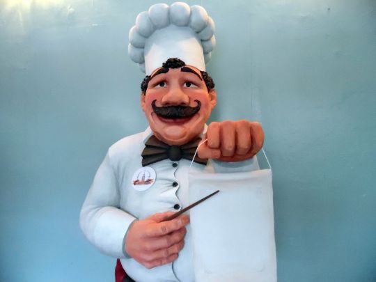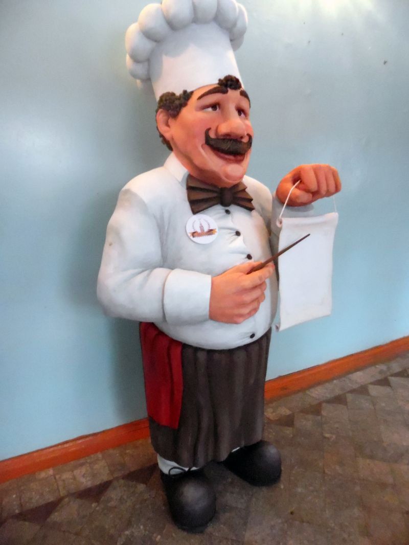 Манекен предназначен для установки в одном из ресторанов в г. Москва. Повар держит в руках листок, с креплением для меню. Одежда манекена выполнена в стиле ресторана, на груди размещен логотип.