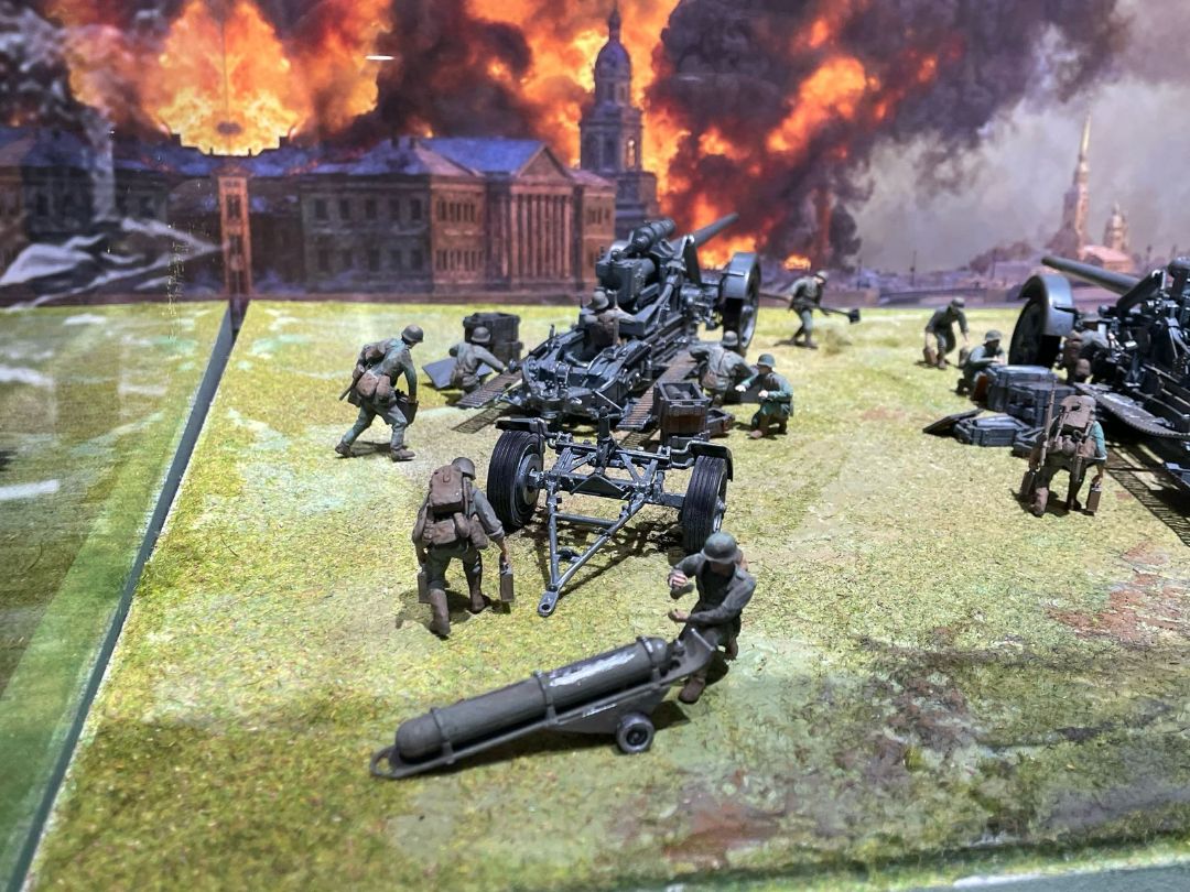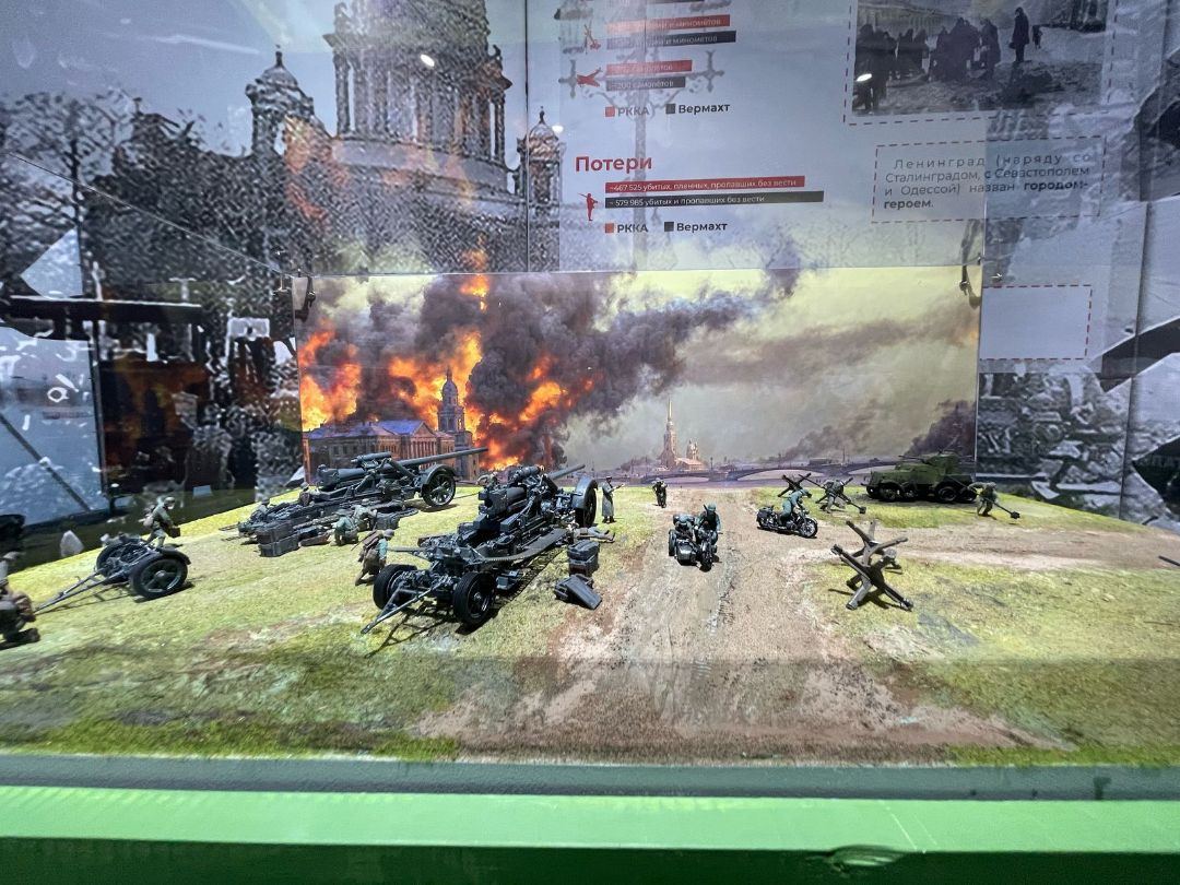 Музейный макет-диорама изображает прорванный разрушенный край бывшей передней обороны Красной Армии, противотанковые ежи 5 шт. На перекрестке дорог табличка «Leningrad»