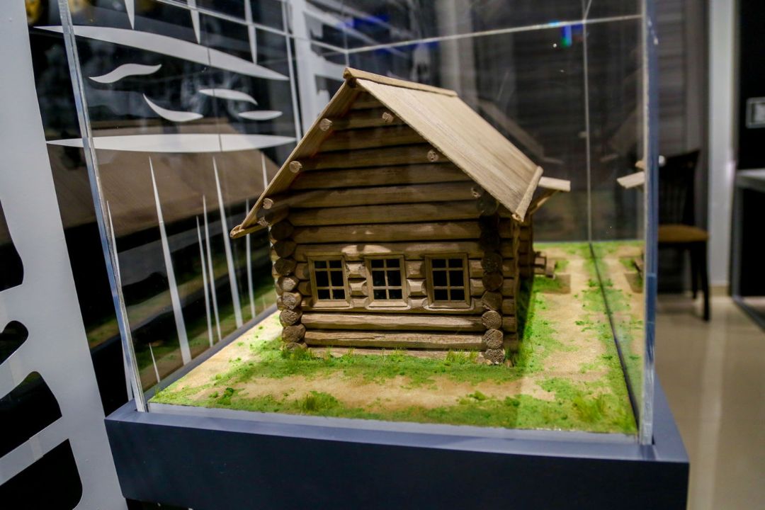 Макет изображает традиционную деревянную избу, в которых жили первые нефтяники Края. Макет выполнен из дерева, искусственно состарен для придания реалистичности.