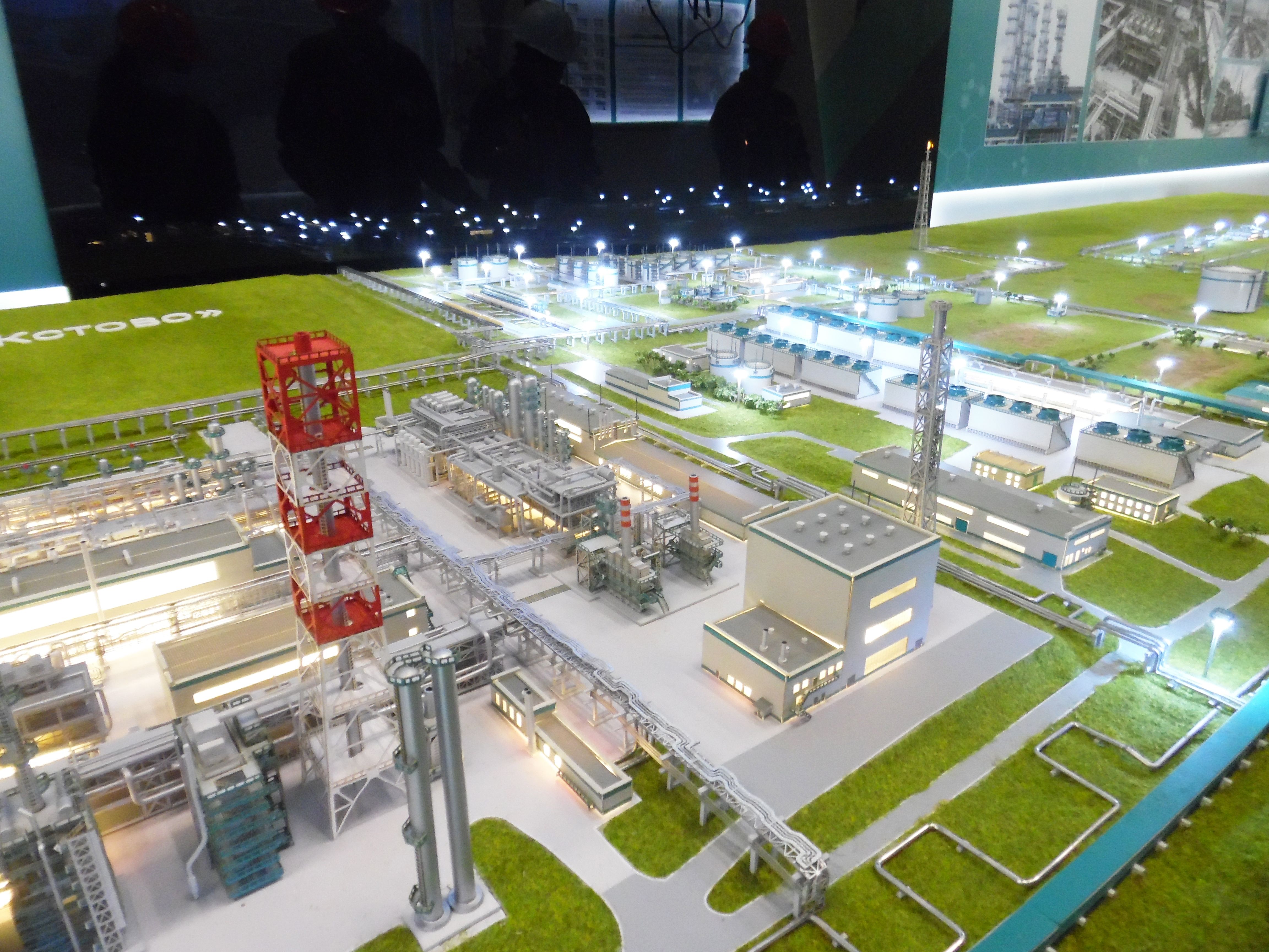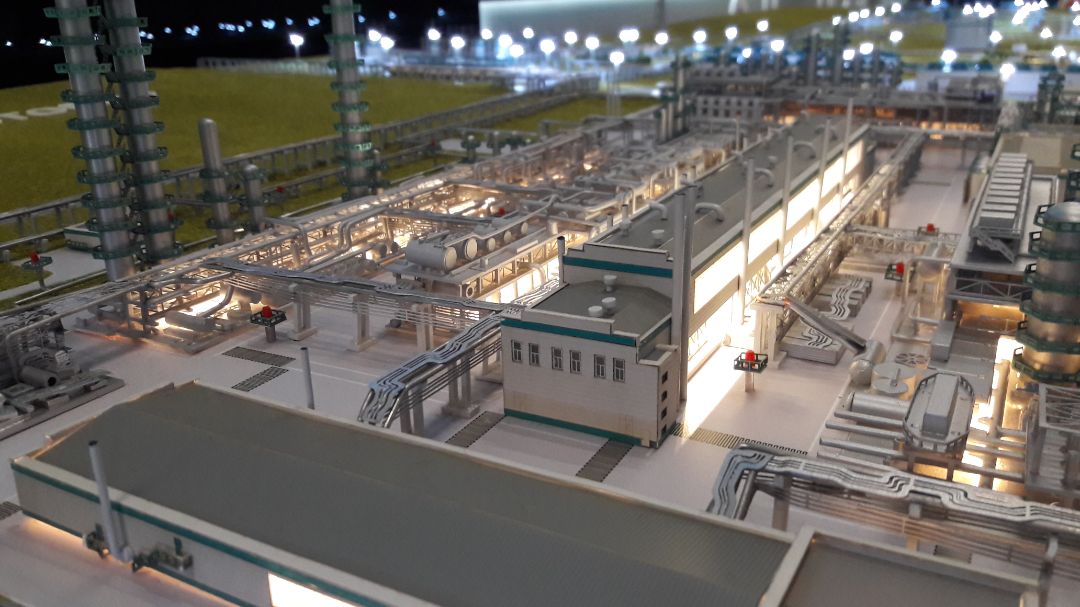 Макет представляет собой условное масштабное изображение завода по производству этилена и бензола. В масштабе воспроизведены технологические постройки, коммуникации.