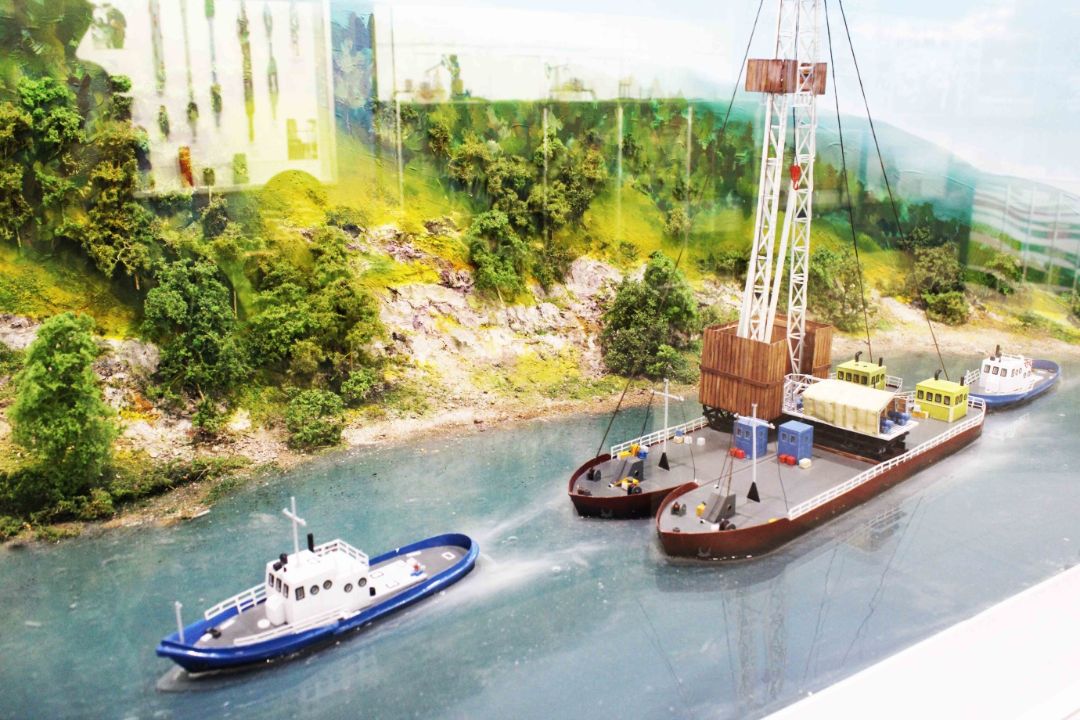музейные экспонаты, в числе которых музейный макет реконструкция "Перевозка буровой по воде".