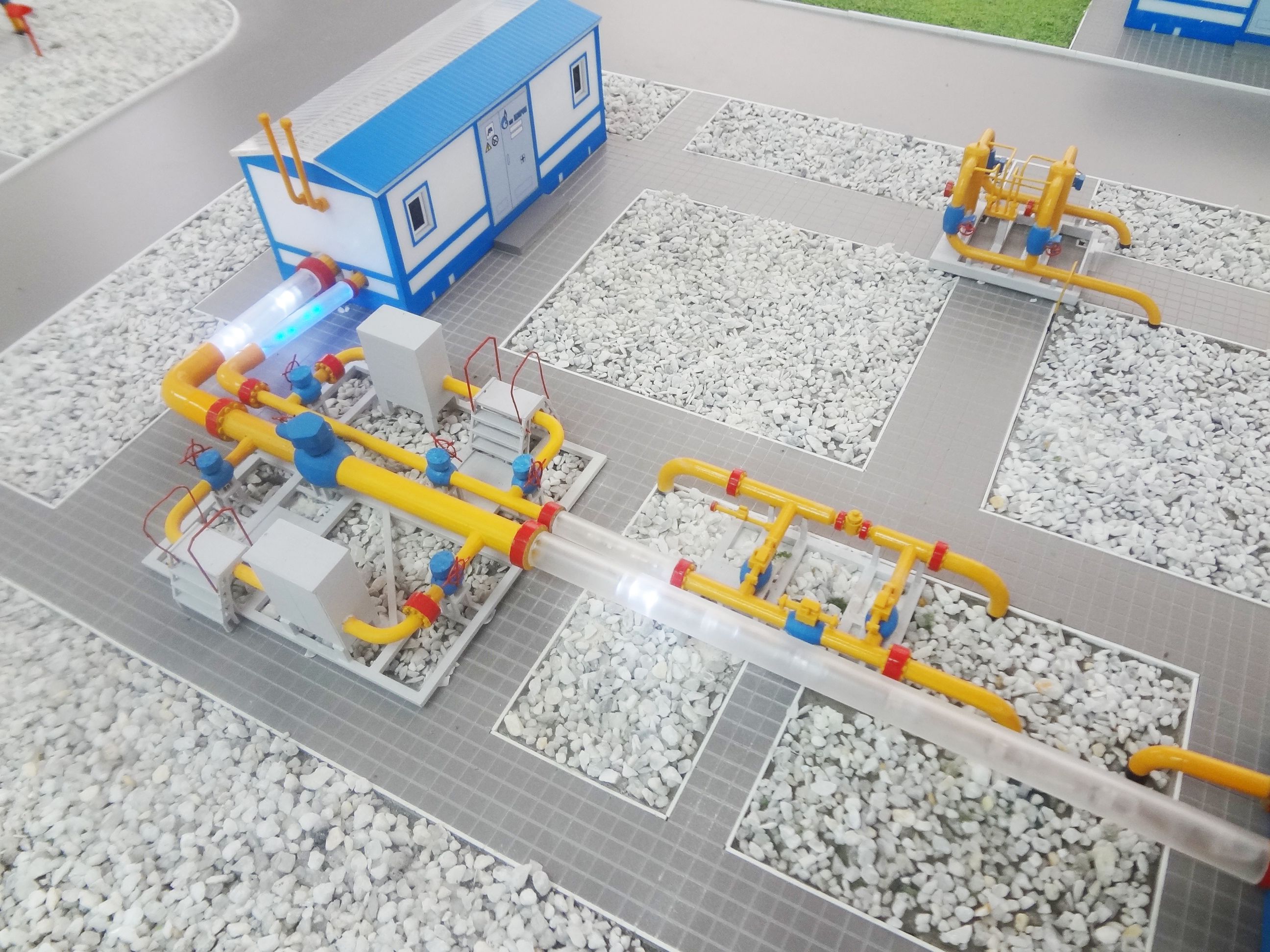 Макет представляет собой масштабное изображение автоматической газораспределительной станции. В масштабе воспроизведены технологические постройки, коммуникации.