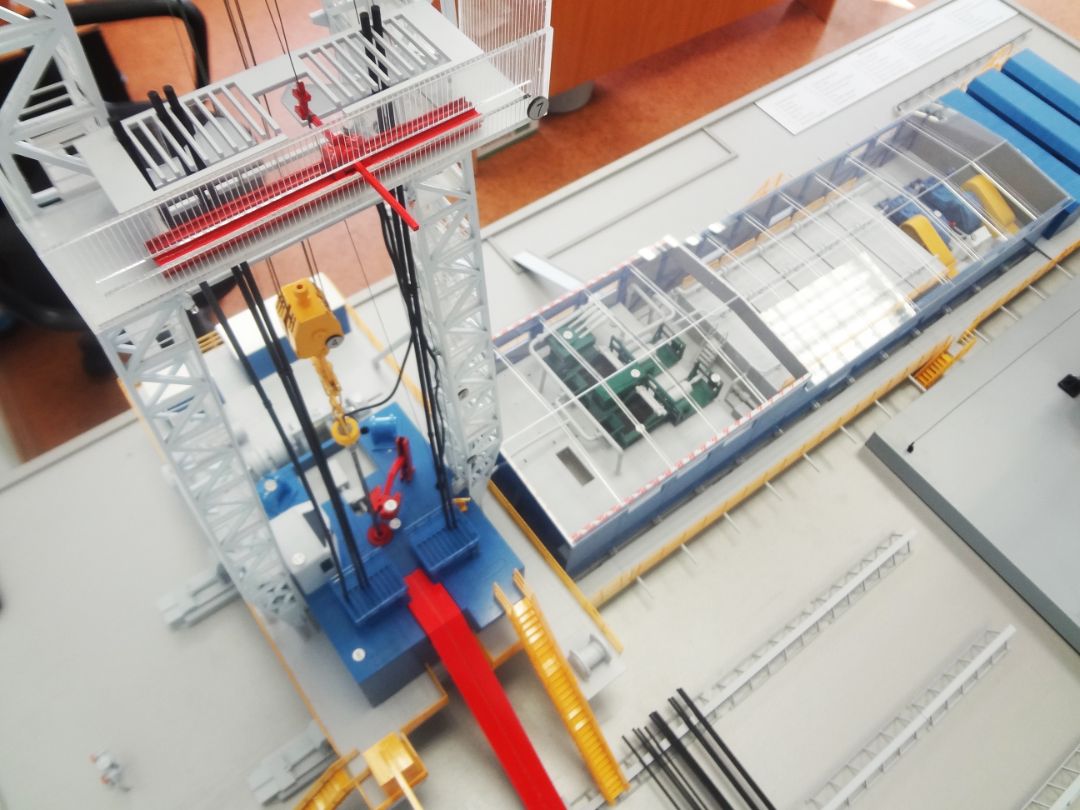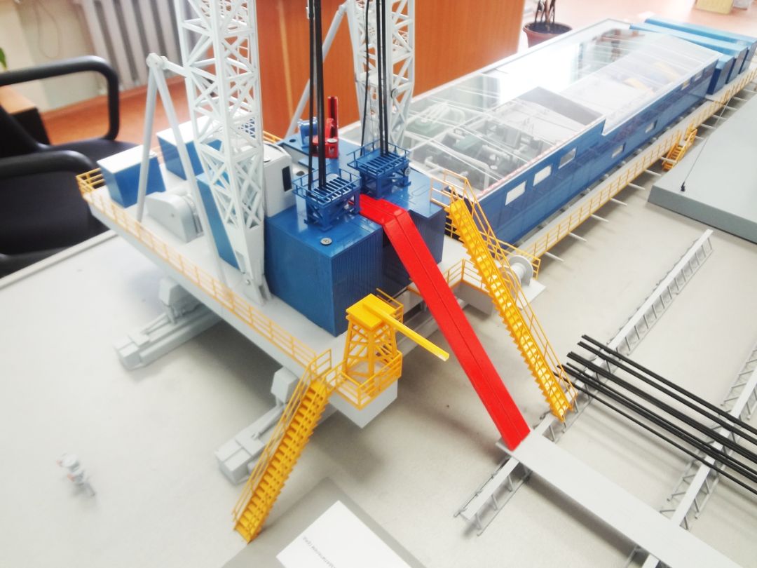 Макет представляет собой масштабное изображение буровой вышки. Особенность макета - электрмеханизация, прозрачные крыши укрытий.