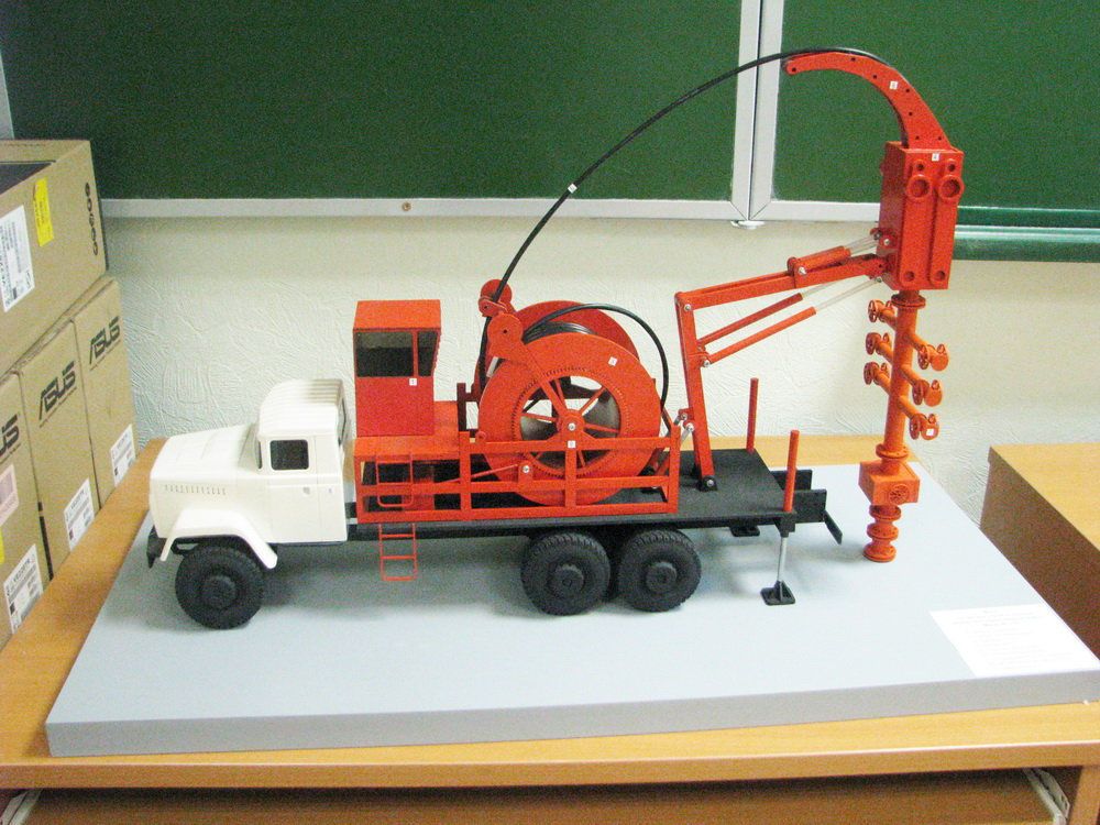 Назначение: Макет предназначен для наглядной демонстрации конструкции установки спуска-подъема непрерывно наматываемой трубы для студентов Института нефти и газа по специальностям: «Машины и оборудование нефтяных и газовых промыслов», «Разработка и эксплуатация нефтяных и газовых месторождений», «Бурение нефтяных и газовых скважин», «Проектирование, сооружение и эксплуатация газонефтепроводов и газонефтехранилищ».
