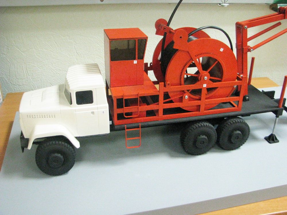 Макет выполнен в настольном варианте. На макете показаны шасси автомобиля КрАЗ, пульт управления, барабан с гибкой трубой, устройство для укладки трубы на барабан, гидроопоры, устройство подачи трубы в скважину, превентор.