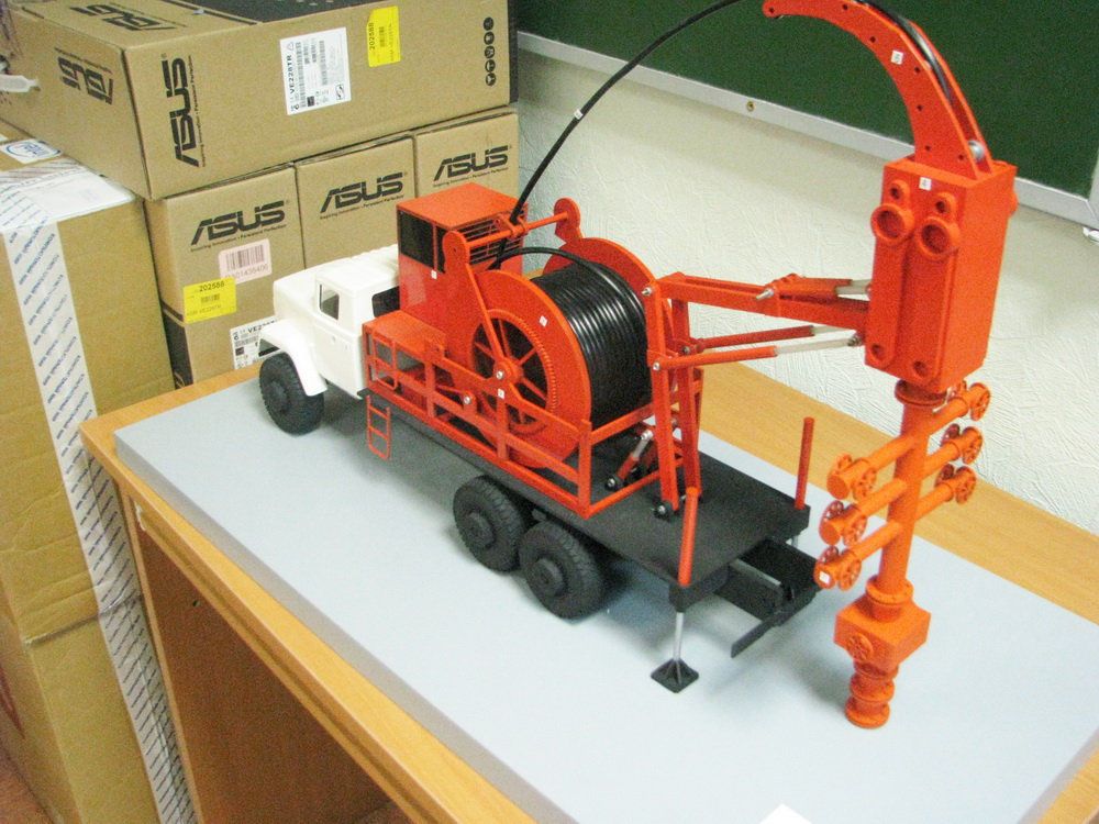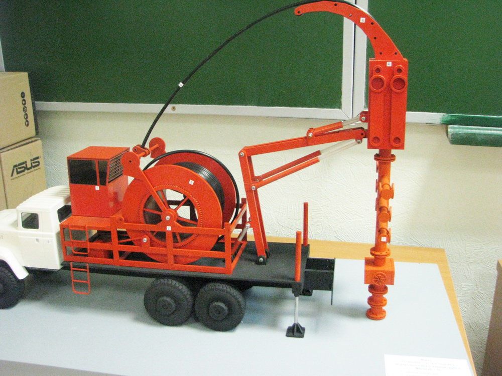 Назначение: Макет предназначен для наглядной демонстрации конструкции установки спуска-подъема непрерывно наматываемой трубы для студентов Института нефти и газа по специальностям: «Машины и оборудование нефтяных и газовых промыслов», «Разработка и эксплуатация нефтяных и газовых месторождений», «Бурение нефтяных и газовых скважин», «Проектирование, сооружение и эксплуатация газонефтепроводов и газонефтехранилищ».