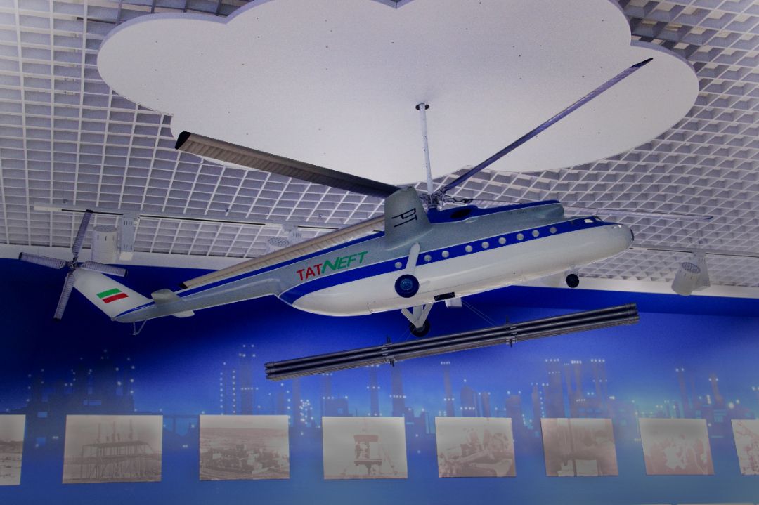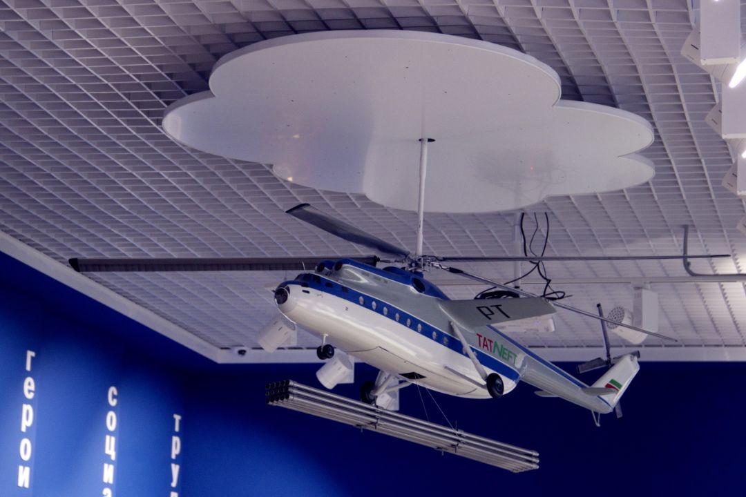 Макет производства 1960-х годов, изображающий процесс воздушной транспортировки деталей буровой вышки, отреставрирован нами в рамках создания «Под ключ» музей нефти г.Лениногорск.