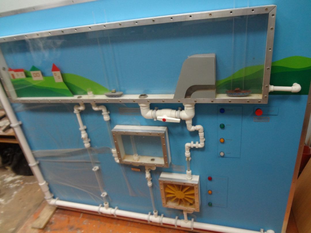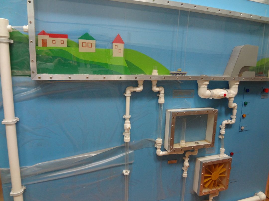 вода постепенно поднимается как в резервуаре №1, так и в резервуаре №2, вместе с уровнем воды поднимаются кораблики в обоих резервуарах; при достижении определенного уровня воды из-за «заборчика» в резервуаре №2 появляется поплавок с надписью «наводнение»;