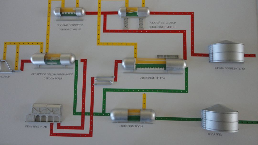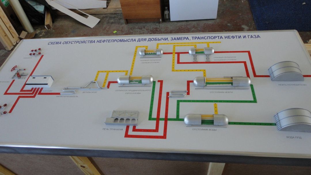 Макет "Схема нефтепромысла" изображает основные объекты месторождения и установки комплексной подготовки нефти и газа.